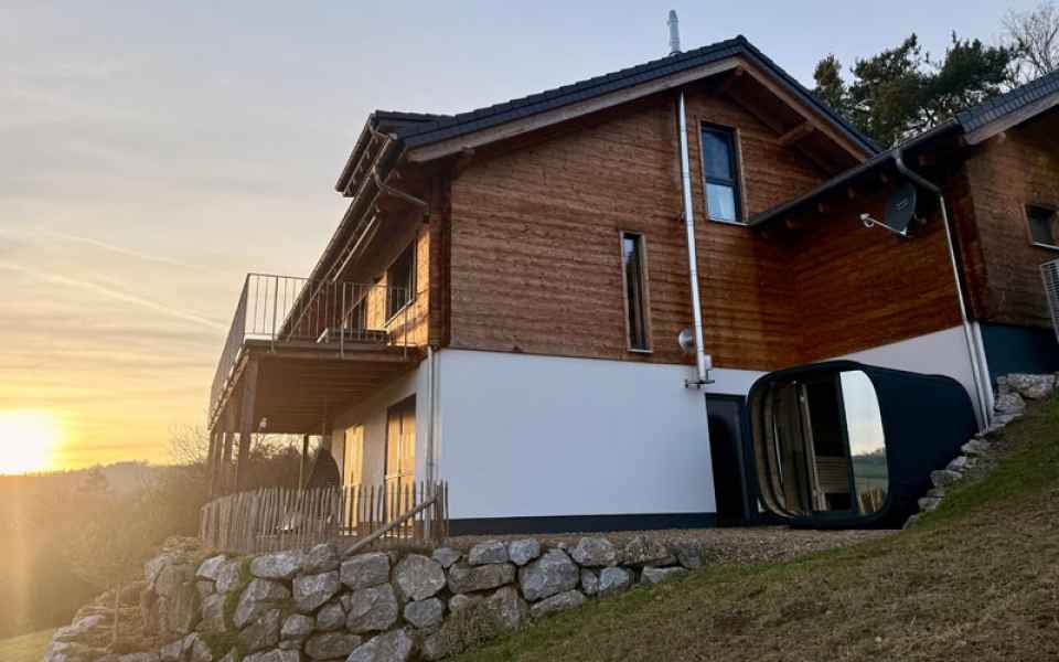 - moderne Außensauna mit Blick auf das Tal